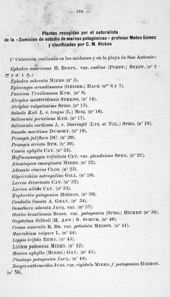 Plantas recogidas por el naturalista de la Comisión de Estudio de Mareas Patagónicas, profesor Mateo Gómez y clasificadas por C. M. Hicken